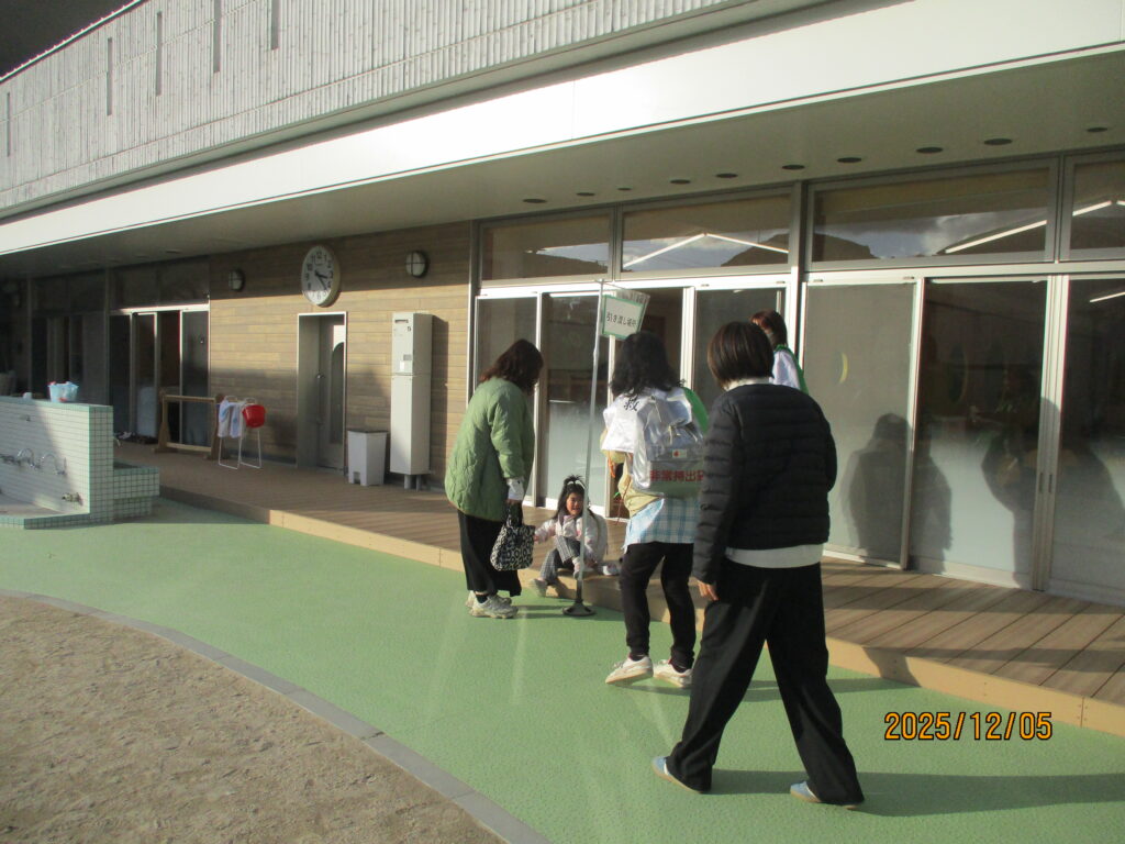 南海トラフ地震で震度5強を想定して引き渡し訓練をしました。平日の午後にも関わらずたくさんの保護者の方が参加して下さいました。