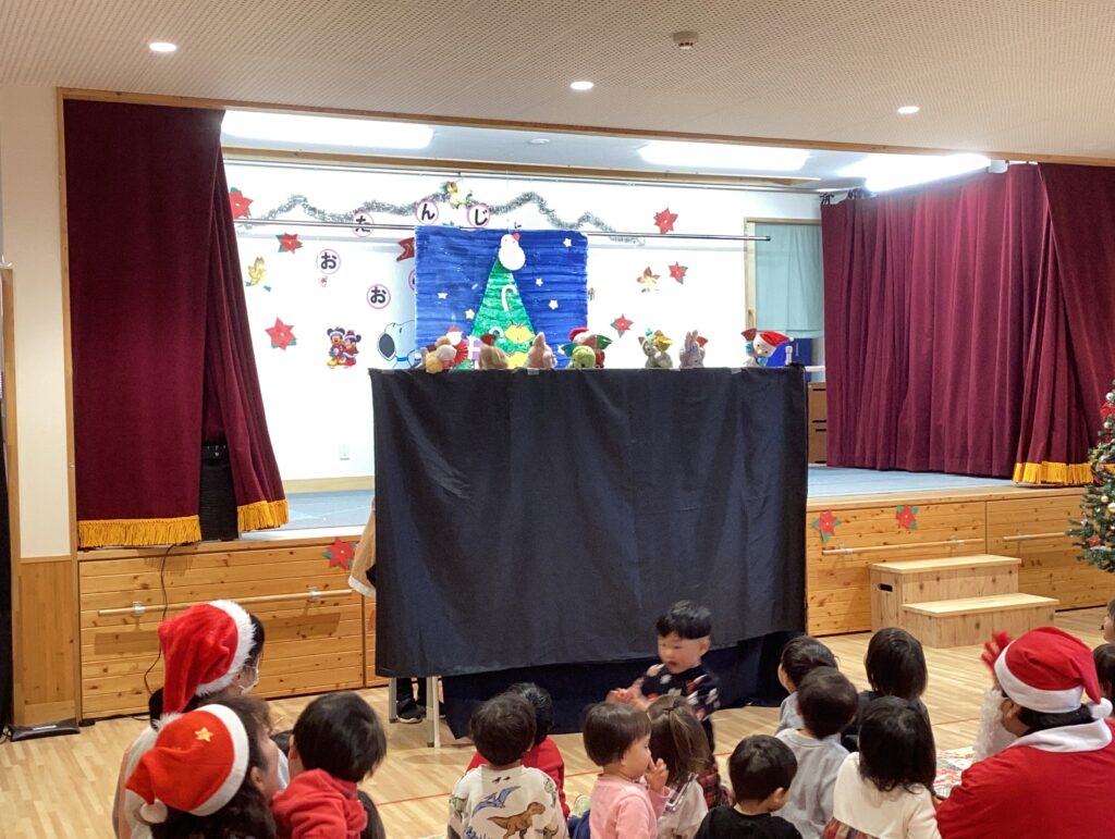 保育者と誕生児との劇や、ハンドベルの出し物を喜んで見ていた子どもたちでした。中には、ハンドベルの音に合わせて、クリスマスソングを口ずさむ姿も見られました。