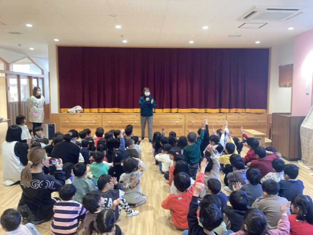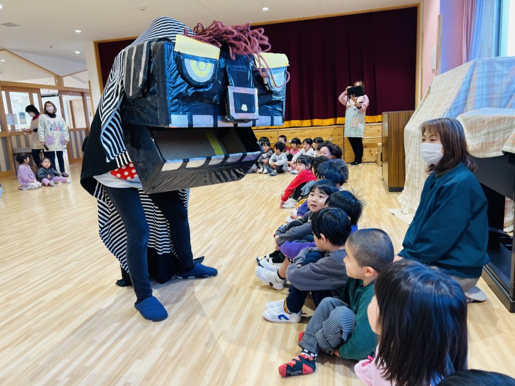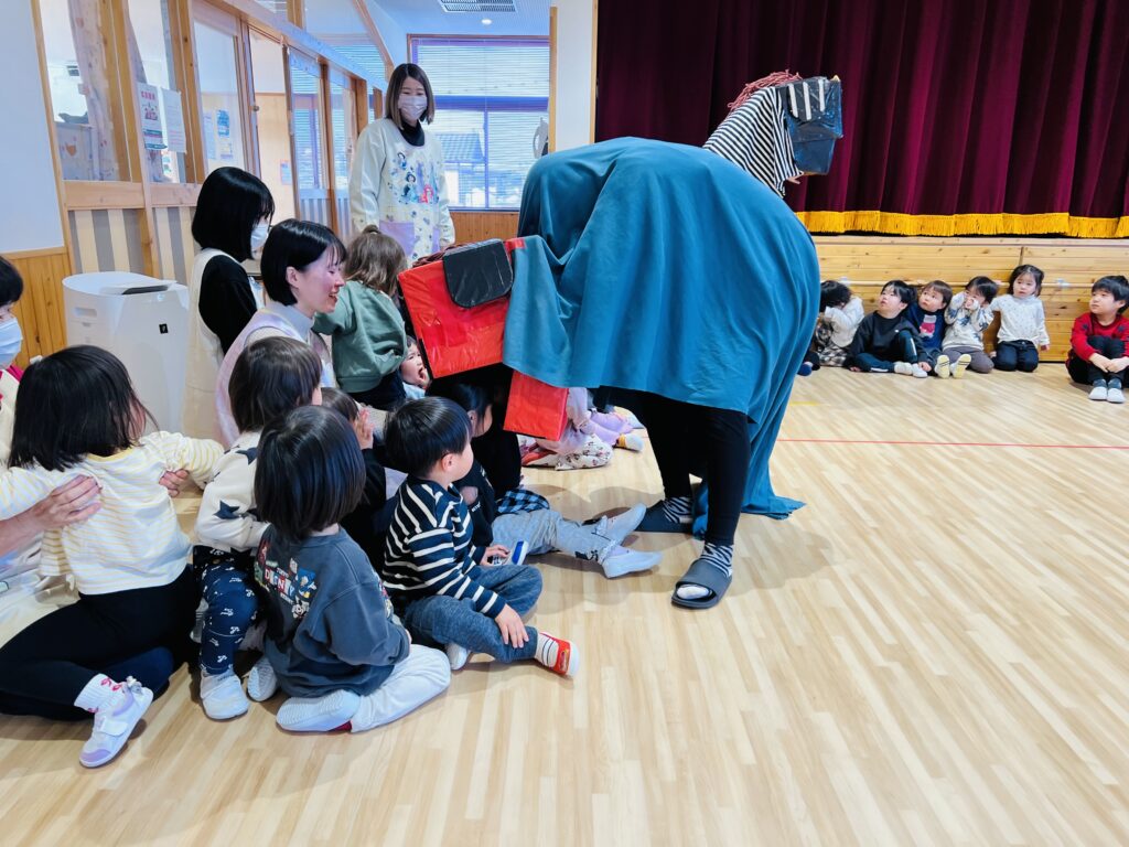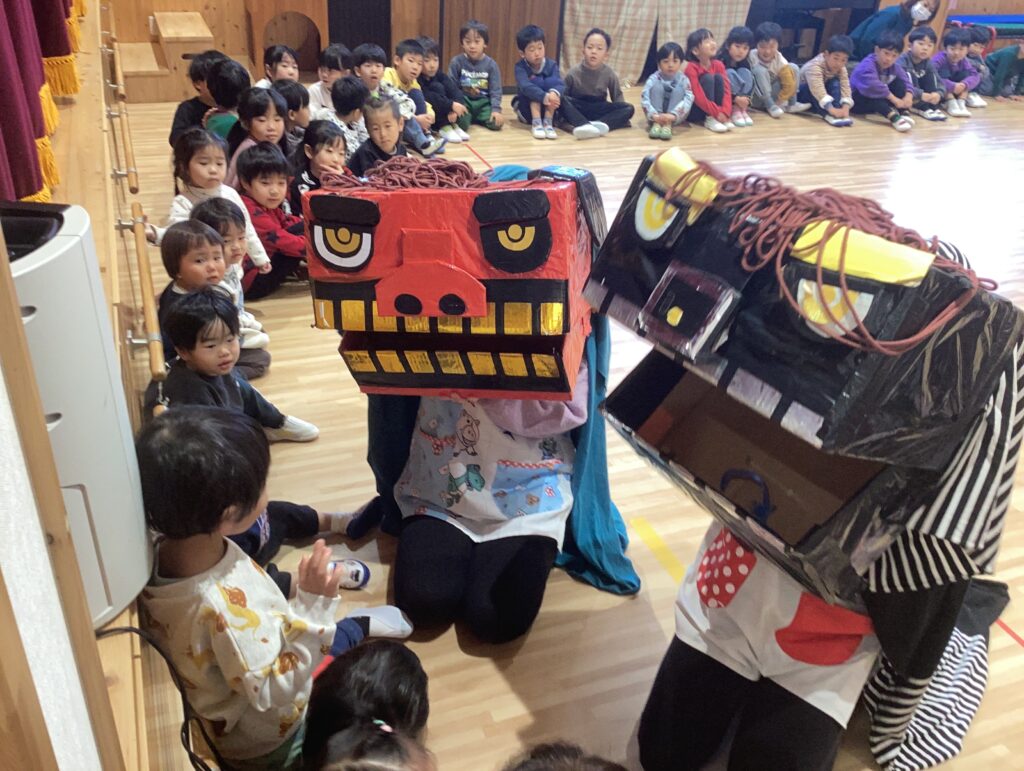 獅子舞が来てくれて、優しく頭をガブっとしてくれました。獅子舞の口が開いた瞬間に、保育者の顔が見え、笑顔で頭を噛んでもらっていた子ども達でした。
