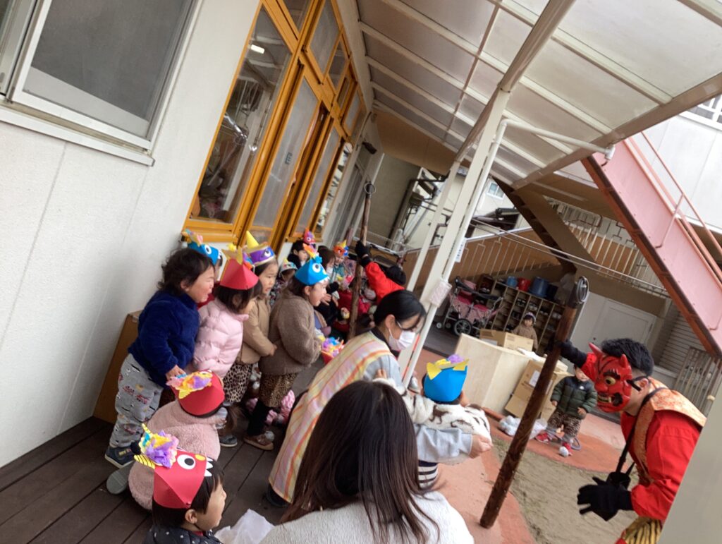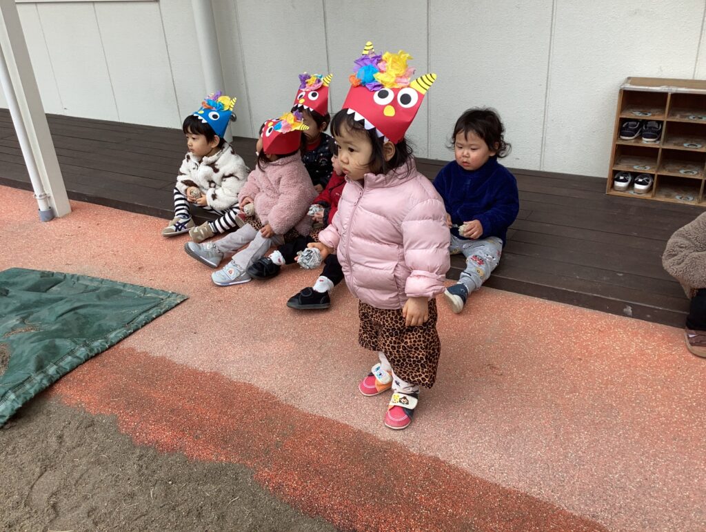 鬼の姿に驚いて泣けてしまうお友だちもいましたが、保育者に抱っこしてもらったり、豆まきをして季節の行事を楽しみました。