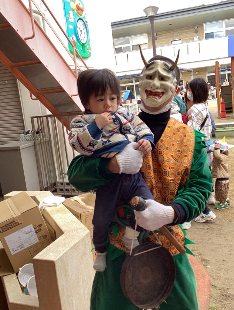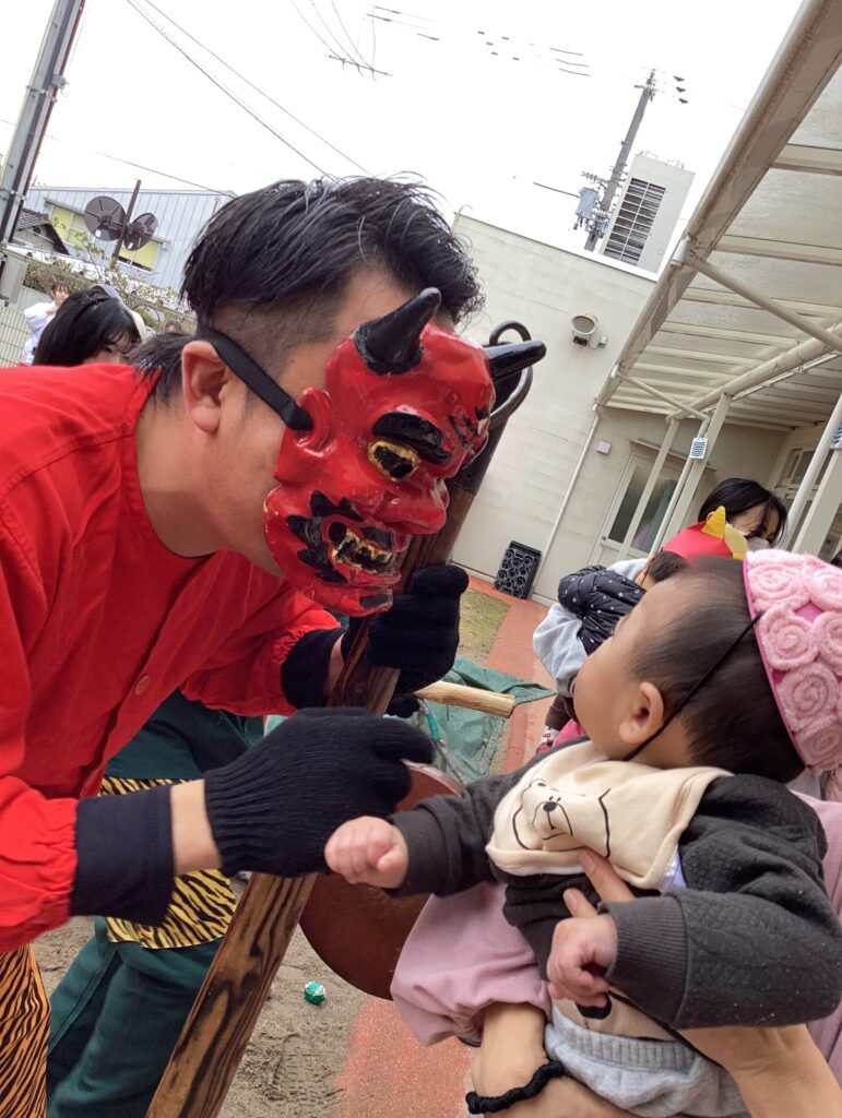 0歳児のお友だちは少し怖かったけど鬼に抱っこしてもらいました。