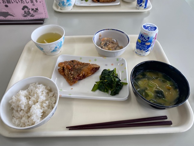奈義駐屯地の広報の方より、展示物の説明など受けながら、戦争に使用したものや特攻隊員の手紙など見ることができました。みなさん、興味津々にたくさんの質問をしましたが、その都度丁寧に分かりやすく教えていただきました。2時間の見学もあっという間に終わり昼食時間となり、自衛隊員の皆さんが食べている同じメニューを食べさせていただきました。本日は昼食メニューをご飯、みそ汁、白身魚のざんぎ、かむかむサラダ、ほうれん草の浸し、ジュースでした。どれもおいしく、皆さん喜んで完食していました。