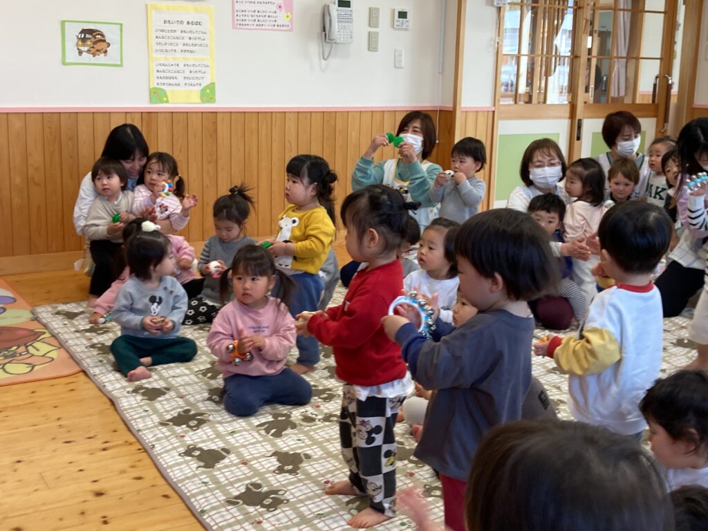 職員による合奏では、子どもたちも一緒に歌ったり鈴やカスタネットを鳴らして楽しみました。