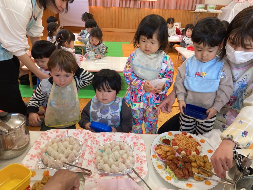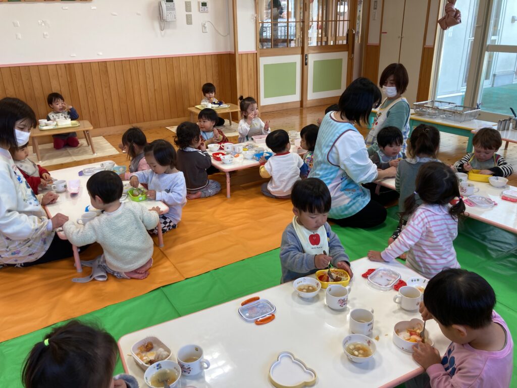 また、ぞう組・きりん組さんはみんなで給食を食べました!