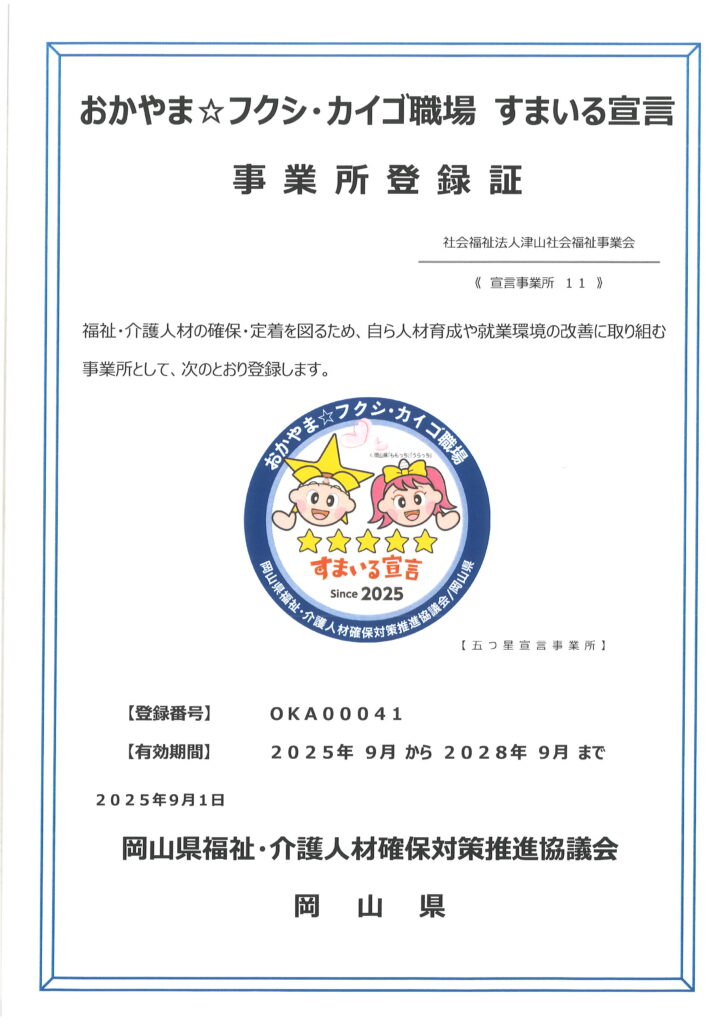 社会福祉法人 津山社会福祉事業会が「おかやま☆フクシ・カイゴ職場 すまいる宣言」事業所として登録され、このたび登録証が届きました。